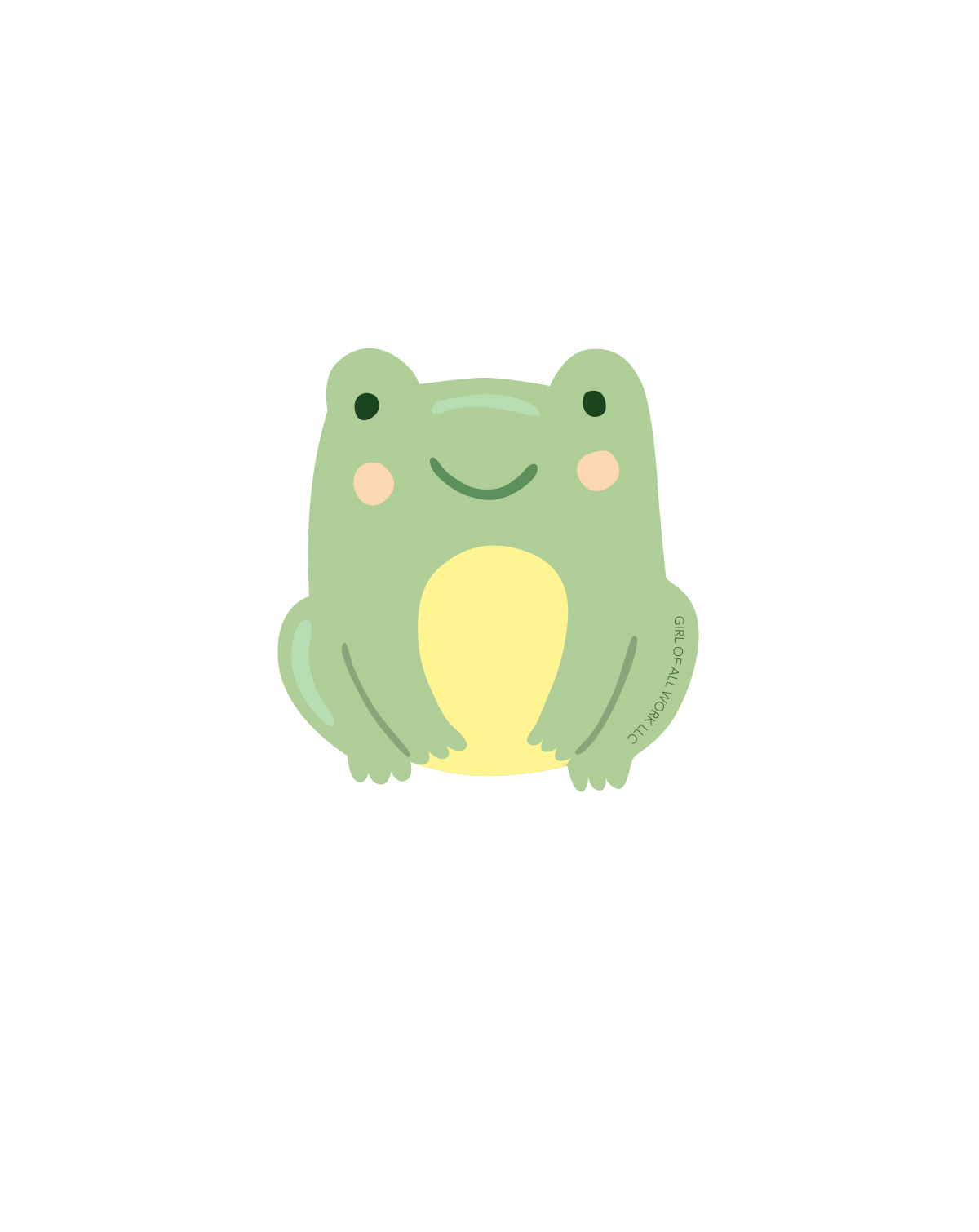 Hop into cuteness overload with this cute frog vinyl sticker! Size: approx. 1.94” x 1.8”/ UV coated and weather-proof. Matte surface.